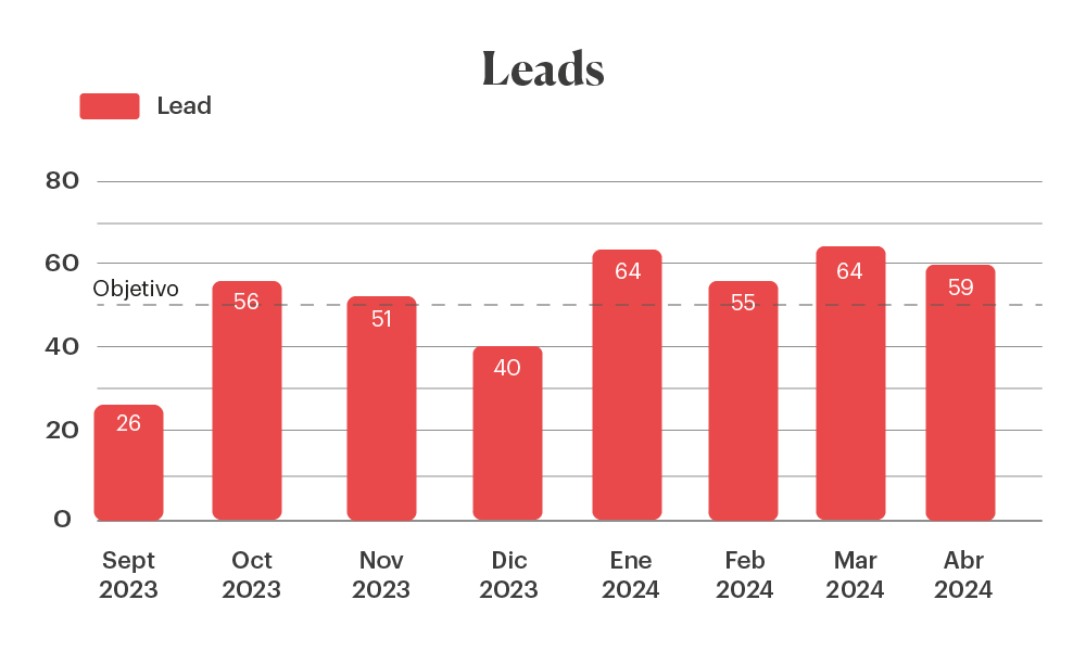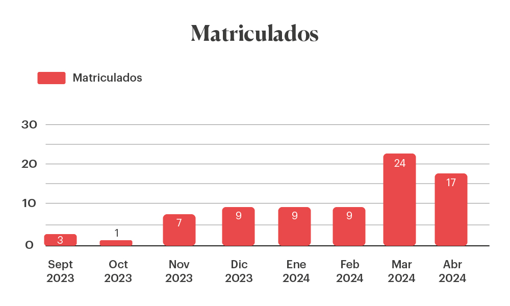Durante el primer cuatrimestre, generamos un promedio de 43 leads mensuales y logramos 6 matriculados, con una tasa de conversión del 14%. En el segundo cuatrimestre, estos números aumentaron a 61 leads mensuales y 15 matriculados, con una tasa de conversión del 25%.